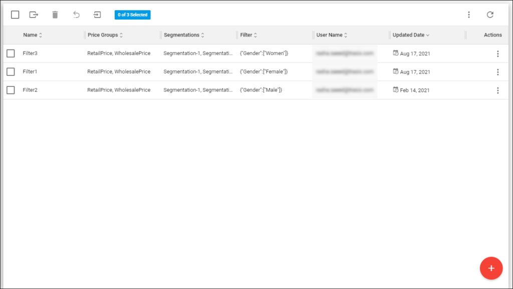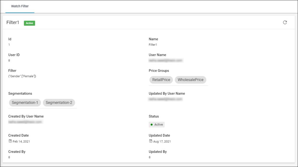 Watch filters defined for the selected catalog are listed. For each one, the price groups, segmentations, filter, and the user who created the filter, and date are displayed. You can view any of the filters by clicking its record or selecting “View record” from the Actions menu next to it, the filter details are displayed as shown below: