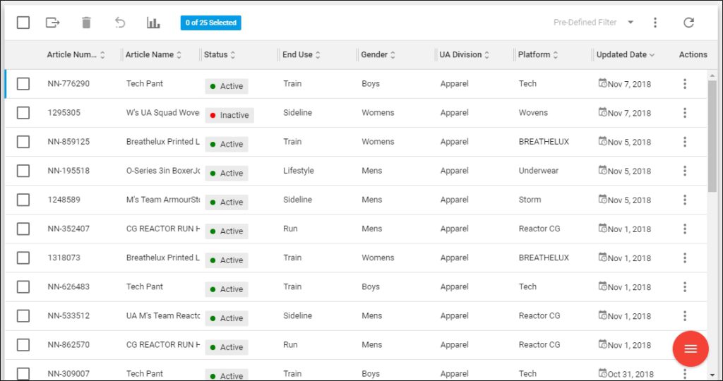 Articles added to the catalog are listed, for each one the name and the attributes you have chosen to show using the Column Chooser. For this catalog, some attributes are calculated on runtime while articles are loaded. You can generate different reports for the line plan catalog as mentioned in “Generate report“.